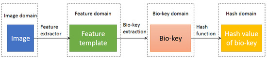 Although biometrics is a powerful tool widely deployed in various security systems, biometric characteristics are largely immutable, resulting in permanent biometric compromise when a feature template is stolen. Thus, the usage of feature templates without protection should be forbidden. Cancellable biometric and biocryptosystem are two main pipelines for biometric template protection, whose frameworks are shown in Figure 4 and Figure 5, respectively. The similarity between the feature templates in feature domain is approximatively preserved between the cancellable templates in cancellable domain, so the evolution algorithms in RA are valid for a cancellable biometric [8]. In biocryptosystems, a bio-key can be extracted/recovered and protected with a one-way function, such as hash function. RA becomes invalid because one-way functions completely damage the correlation/linkage between the input and output. However, PA uses the spoofing carriers containing the genuine users’ original target biometric images to cheat biometric systems; while FAA uses the fake image set to cheat biometric systems. Neither PA nor FAA requires the data in feature domain, cancellable domain, and hash domain. Thus, PA and FAA are still valid in biocryptosystems. If a fake feature template is similar enough to a target feature template, i.e., the similarity in feature domain is satisfied, the bio-key in bio-key domain can be extracted/recovered from the fake feature template.