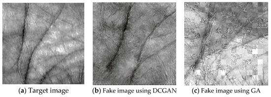 Figure 8 shows the naturalness of three image samples, namely, target images (real image), fake images in this paper, and fake images reconstructed with GA [21]. The fake images (Figure 8b) and (Figure 8c) are indeed very different from the target image (Figure 8a); however, their feature templates are highly similar. Thus, (Figure 8b) and (Figure 8c) can cheat a palmprint biometric system since the similarity measure takes place in feature domain rather than in image domain. The similarities in image domain and feature domain are nonequivalent. Neither (Figure 8b) nor (Figure 8c) satisfies the similarity in image domain, but they both satisfy the similarity in feature domain.