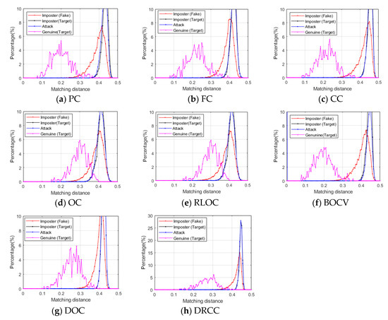 Four distance distributions. (a) palm code (PC), (b) fusion code (FC), (c) competitive code (CC), (d) ordinal code (OC), (e) robust line orientation code (RLOC), (f) binary orientation co-occurrence vector (BOCV), (g) double orientation code (DOC), and (h) discriminative and robust competitive code (DRCC)