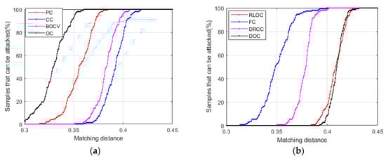 The success rates of FAA, i.e., the ratios between the target images attacked successfully and the total target images, are shown in Figure 12. The eight palmprint coding methods are divided into two groups for clear comparison The success rates of FAA increase with the increment of distance threshold.