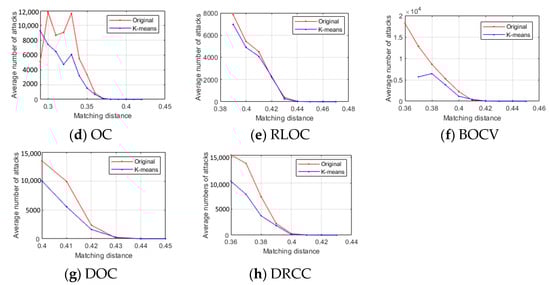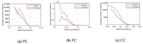 The attack times can be calculated by the number of the fake images used to impersonate the genuine user until FAA is successful. The original results are tested on a fake image set containing 40,000 fake images, while the K-means results are tested on the fake image set after K-means clustering, which contains 20,0000 fake images. The comparisons in Figure 13 confirm that the clustering can effectively reduce the number of attack times.