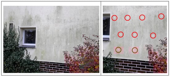 Algae create an undesirable aesthetic effect on the facade surface. Most algae live in water, but some species also live in the air (aerophytic algae) and receive water in the form of rain or water vapor. Aerophytes are microscopic green or blue-green algae in our climate. On buildings, aerophytes live on wet and north-facing walls. If living conditions allow them, these microorganisms will multiply and form visible colonies (see Figure 2). Organic plasters, which form the surface layer of ETICS, are also suitable substrates [3,12,13].