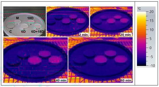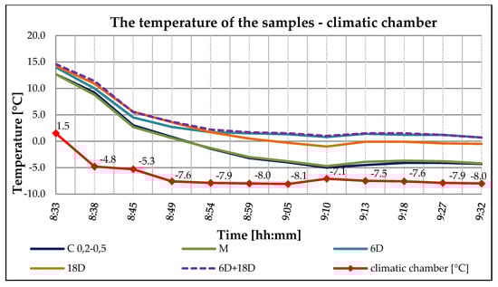 The samples tested with a thermal camera were standard filler Carolith 0.2–0.5 (crushed limestone), PCM Micronal DS 5040 X (M), Nextek (6D), Nextek (18D) and their combinations (6D + 18D) (see Figure 5). The specimens were placed in a climatic chamber at a temperature of 12 °C and a relative humidity of 50% for 24 h. At the start of the test, the temperature in the climate chamber was lowered to −12 °C and the temperature development of the test samples was monitored for 1 . The ambient temperature dropped to −8 °C within 20 min and remained at this level until the end of the measurement. It is clear from Figure 5 that PCM Micronal was close to Carolith in its behavior, as the wax was no longer activated due to the previous storage of the sample at a temperature of 12 °C. Micronal acts like a standard filler, without any benefit in terms of heat release, which was assumed due to the wax adjustment exclusively for the interior (thermal comfort in the rooms). On the other hand, Nextek specimens showed the ability to release heat at 12 °C despite previous storage. Sample 18 D fulfilled its function until the sample temperature was close to 2 °C, then due to the properties of the wax, the temperature gradually decreases (see Figure 5). It is interesting to activate the wax even after storage, which is below the guaranteed melting temperature point. Sample 6D had a time lag compared to sample 18D, which on the other hand showed the ability to perform PCM function below 2 °C. The last sample was a 50:50 Nextek 6D and 18D combination. The result of this combination is that it is very efficient and allows you to take advantage of both products and their settings. This combination is then effective to a greater extent and covers a significant proportion of normal outdoor temperatures. The above tests have shown that PCM from Nextek can be used in exterior materials and their thermo-technical properties.