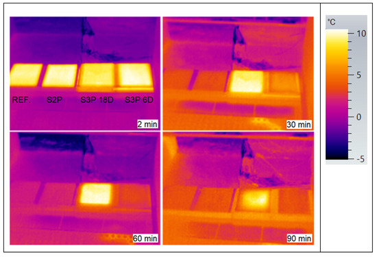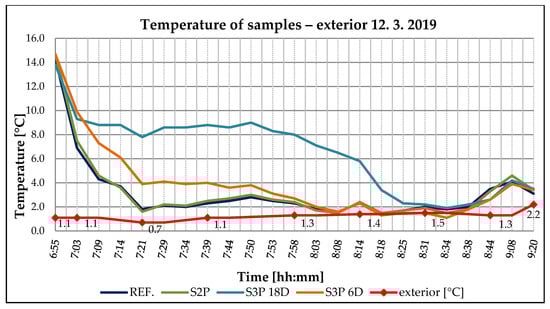 The samples used in the test were standard base coat (REF.), a co-developed base coat with a high temperature fly ash (S2P) and a base coat with PCM and fly ash (S3P 6D and S3P 18D). In samples S3P 6D and S3 18D, the filler (Carolith 0.2–0.5) was replaced by the above-mentioned thermotropic material. The samples were placed in a laboratory environment at 23 °C and 50% relative humidity. Later they were placed outdoors at a temperature of about 1–2 °C and a relative air humidity of 58% and the temperature was measured for 2.5 h (see Figure 10). The samples were protected from direct sun exposure. The results show that the temperatures of both PCM-free base coats dropped to 2 °C after about 25 min, while the S3P 18D base coat reached a similar level, after about 90 min (see Figure 10).
