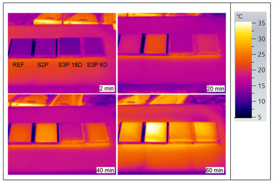 Thermal images of test specimens (from left: reference base coat, base coat with fly ash, base coat with fly ash and PCM Nextek 18D, base coat with fly ash and PCM Nextek 6D), exterior 1 °C and 58% humidity.