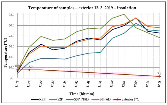 As outlined in the last test, Figure 12, the base coat samples were tested outdoors for one hour at a temperature of about 9 °C and 68% relative humidity. The ambient temperature dropped to 5.8 °C within 1 h of measurement. The results show us the effect of direct sunlight on the sample for about 40 min and subsequent clouding. The figures show that the surface temperatures of the PCM-free sample have a faster temperature rise than the PCM samples, where the increase is gradual. The best result was the PCM Nextek 18 D sample again. At 12:01, clouds shaded the samples and temperatures dropped again, which caused a sharper fall for a sample without PCM. The results thus show that the thermal behavior of the PCM material is more gentle on the thermodynamic stress of the ETICS and limits the possibility of micro-cracks. Thus, the rise and fall of the base coat temperature is moderated by the PCM.