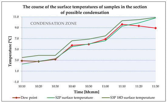 The systems were measured within 8 h and two complete cycles of cooling and heating the samples. The beginning of the measurement started at 12 °C. The resulting measurement showed different sample behavior and the surface temperature of the sample with PCM S3P 18D decreased less than in the case of the sample without PCM (S2P). In the condensation zone, this difference is better seen (see Figure 14).