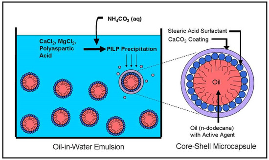 Core-shell microparticles were generated using the PILP process to coat oil-in-water emulsion droplets (for hydrophobic active agents) and phospholipid bilayer liposomes (for both hydrophobic and hydrophilic active agents) with a smooth and continuous calcium carbonate shell. The microcapsules may be suitable for potential use in drug delivery and other commercial applications where encapsulation of an active agent can be done within the fluidic interior of the core-shell system. The PILP method of generating microcapsules presented here may be used as an alternative to, or in conjunction with, current liposome- or emulsion-coating technologies to bypass or eliminate many of the challenges and limitations they face, such as leakage, premature release, destruction through lyophilization, storage instability, and ease of packaging and transport. The smooth and continuous calcite coating that the PILP process generates is quite remarkable considering that calcite usually forms faceted crystals when generated in vitro by the conventional crystallization process. Further investigations not included here may be required to tailor the core-shell microcapsule product depending on the intended application and its associated chemical environment. These further investigations include adjustments to the synthesis protocol to yield control over the size and size distribution, drug loading, release, and encapsulation efficiencies, as well as studies to evaluate the biocompatibility/bioactivity of the resulting calcium carbonate-coated microcapsule.