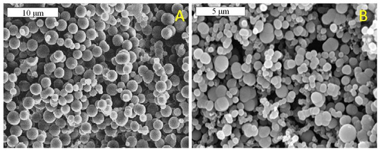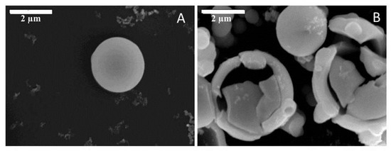 To demonstrate pH dependent degradation, core-shell microcapsules were created as described in the synthesis section except that, prior to final suspension in ethanol, the microcapsules were suspended in either 2 mL of 0.1 mM, pH 4, HCl aqueous solution or nano-pure water. In the case of the pH 4 HCl aqueous solution, the sample was resuspended and swirled gently, by hand, for 15 s at which point the solution was quenched with 2 mL of a 0.1 mN, pH 10 NaOH aqueous solution. Immediately following the quenching, 36 mL of anhydrous ethanol was added to halt any further degradation. The whole suspension was then centrifuged at 8000 rpm for 4 min, the supernatant was discarded, and the pellet was resuspended in 1 anhydrous ethanol for analysis. In the case of the pH 6.8 nano-pure water, the sample was resuspended and swirled gently, by hand, for 2 min. Immediately following the swirling, 18 mL of anhydrous ethanol was added. The whole suspension was centrifuged at 8000 rpm for 4 min, the supernatant discarded, and the pellet was resuspended in 1 mL anhydrous ethanol for analysis. Then, 200 µL of the degraded core-shells suspensions were deposited on a glass slide, dried, and sputter-coated with Au/Pd. The visual SEM analysis was conducted using a JEOL 6400 SEM (JEOL USA, Peabody, MA, USA) with a 15 kV accelerating voltage.