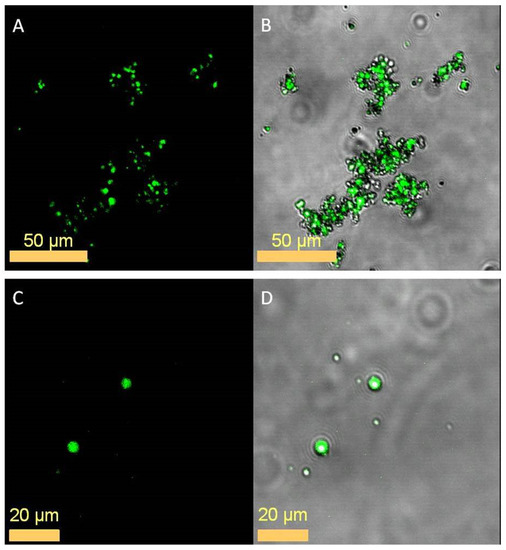 Confocal fluorescence microscopy of microcapsules from CaCO3-coated emulsion droplets with Nile-Red fluorescent dye entrapped within the oily interior of the emulsion. Confocal fluorescence images are shown to the left (A,C), while the right images (B,D) show an overlay with the bright-field images. The high intensity of the fluorescence suggests that the entrapment of the active agent was very successful, as seen in both a large collection of particles in (A), as well as in individual microcapsules shown at higher magnification in (C). The fluorescence corresponds to the interior of the microcapsules for the cluster (B) and the individual microcapsules (D) when overlapped with their respective bright-field images.