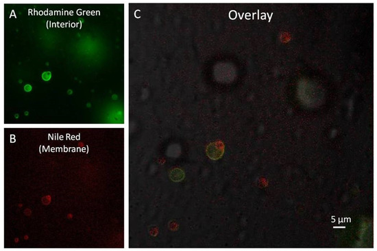 Confocal fluorescence microscopy was used to demonstrate the internal entrapment of model active agent compounds within the core-shell particles. Capsules synthesized with rhodamine 110 and/or Nile Red fluorescent dye encapsulated in the interior were washed and subsequently examined. Figure 7 shows the entrapment of Nile Red fluorescent dye within the oil-interior of the emulsion-derived microcapsules. The liposome-derived core-shell microcapsules display the ability to entrap both hydrophobic (Nile Red dye) and hydrophilic (rhodamine 110) compounds, as is shown in Figure 8A,B, respectively, as well as in the overlay of both images shown in Figure 8C