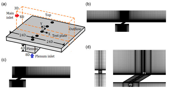 The CFD simulations were performed with a three-dimensional mesh. The orange dashed lines in Figure 1a show the computational domain. The geometry of real turbine blades is more complex than that represented by the computational domain. However, the results obtained for a flat plate could be applied to real turbine blades with some corrections [16]. The geometry was adopted from Seo, Lee, and Ligrani [12]. In their experimental facility, five cooling holes were created on the plate in a row. To reduce computation time, in the present study, the computational domain was created with a single hole by applying the periodic boundary condition to the sides of the domain.