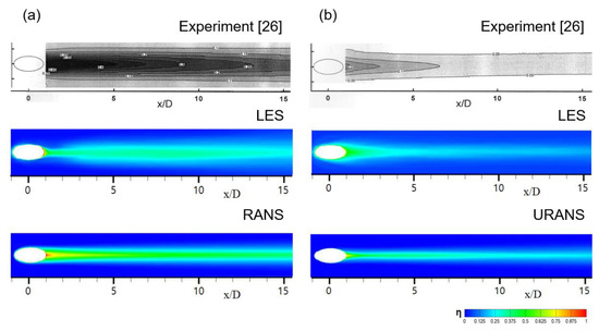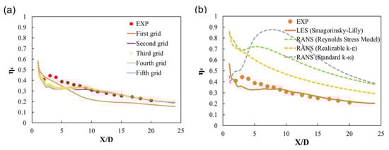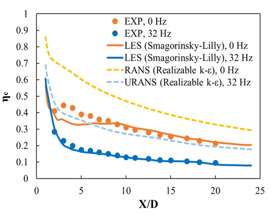 Figure 2b illustrates that several RANS models overpredicted the centerline effectiveness in the steady state, and results of the realizable k-ε model differed the least from the experimental data. Even the Reynolds stress model, which solves more equations to reflect the anisotropy of turbulence, more severely overpredicted the centerline effectiveness than the realizable k-ε model after x/D = 5. The results of the k-ω model differed the most from the experimental results among the compared turbulence models. Based on these results, the realizable k-ε model was adopted for the unsteady RANS, in which pulsation was applied to the main flow.