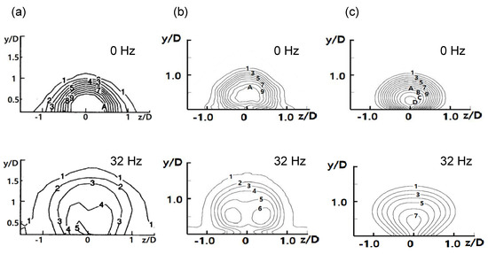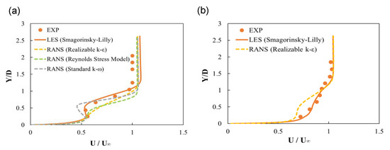 Figure 10 shows the time-averaged dimensionless streamwise velocity profiles at x/D = 5 and z/D = 0 for 0 and 32 Hz. The experimentally measured streamwise velocity profile at 0 Hz [15] has a local peak between y/D = 0 and 0.5 because of coolant jet penetration into the boundary layer. The streamwise velocity profile obtained using LES predicted this peak well, whereas the various RANS models failed to predict the peak exactly, as shown in Figure 10a. In Figure 10b, the time-averaged dimensionless streamwise velocity profiles at 32 Hz obtained by LES match well with the experimental results [15], whereas the RANS realizable k-ε model did not predict the velocity profile between y/D = 0 and 1 exactly, and the velocity gradient predicted by RANS was rather different from those in the experimental and LES results.