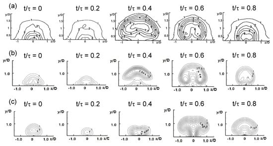 The time-averaged dimensionless Urms profiles at x/D = 5 and z/D = 0 as obtained by the LES Smagorinsky–Lilly model and the URANS realizable k-ε model under 32 Hz pulsation are also shown in the figure. As shown in Figure 12a, as t/τ decreases from 0 to 0.4, the y/D values corresponding to the maximum values of Urms decrease because the heights of the large vortex at x/D = 5 decrease, as illustrated in Figure 8a. When t/τ increases from 0.4 to 0.8, the y/D values corresponding to the maximum Urms values increase because the height of the large vortex at x/D = 5 increases. Therefore, the y/D values corresponding to the maximum Urms values are periodic because of the outline of the large coolant vortices. This outline is attributed to the periodic blowing ratios expressed by Equation (2), even though the averaged blowing ratio is 0.5.