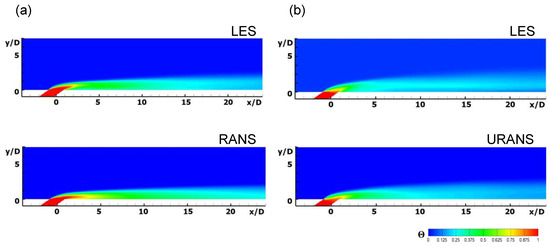 Phase-averaged dimensionless temperature contours at y/D = 0 (upper) and z/D = 0 (lower) for 32 Hz: (a) LES (Smagorinsky–Lilly) and (b) unsteady RANS (URANS) (realizable k-ε).