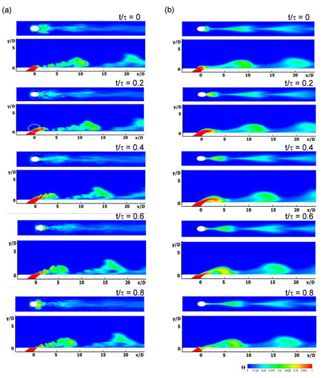 Figure 5 illustrates the phase-averaged dimensionless temperature contours at x/D = 5 obtained experimentally [12], as well as by means of LES and RANS, under 32 Hz pulsation. The phase-averaged dimensionless temperature contours shown in Figure 5b were obtained by averaging 50 instantaneous LES contours to achieve bilateral symmetry. The change in the distributions was attributed to periodic changes in the blowing ratio, as given by Equation (2). The dimensionless temperature contours obtained by RANS were different from the experimental results, whereas the LES contours were quite similar to the experimental contours because the jet lift-off and various other vortexes, such as CRVP, generated due to jet injection were considerably better predicted by LES than RANS. At t/τ = 0.4, the lift-off of the injectant observed in the experiment was reproduced by LES but was not predicted by RANS. At t/τ = 0.6, a kidney-shaped temperature distribution was observed by the CRVP in the experiment. In LES, the kidney-shaped temperature distribution similar to that in the experiment was observed, but in RANS, a temperature peak occurred at z/D = 0.