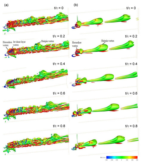 In the Q-criterion, Q is defined as the difference between the magnitude of the rotation rate and the strain rate, and it represents the dominance of the rotation rate compared to the strain rate [28,29]. Figure 9a,b shows the instantaneous Q-criterion contours with iso-surfaces of levels 1000 and 500, colored with vorticity ωz for the 32 Hz pulsation, and obtained with LES and URANS, respectively. The Q-criterion contours are colored with y-vorticity in each phase. Compared to the Q-criterion contours predicted using URANS, those predicted by LES indicate that LES can predict more complex vortex structures, including CRVP, hairpin, jet shear layer, and horseshoe vortices. URANS predicted only simple vortex structures, such as the horseshoe vortex and the hairpin vortex, as shown in Figure 9b. In the Q contour obtained using LES, complex vortical structures continuously exist under the injectant, but in the URANS result, they appear partially under the hairpin vortices.