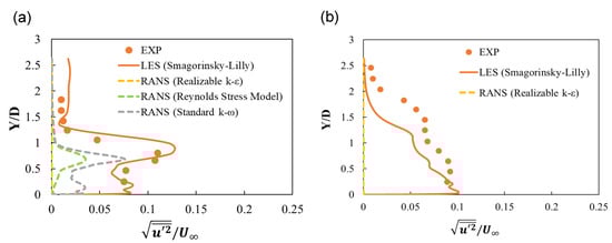 Time-averaged dimensionless Urms profiles obtained using RANS and LES models at x/D = 5 and z/D = 0: (a) 0 Hz and (b) 32 Hz.