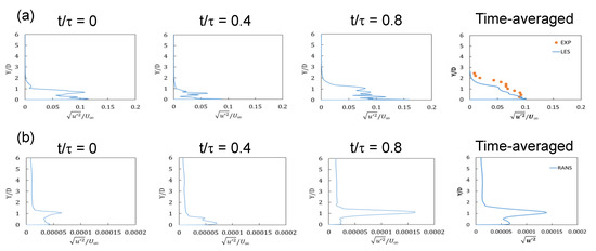 In terms of the point at which the turbulence intensity becomes maximum depending on the phase in Figure 12a, double peaks are observed near the wall when t/τ = 0 and around y/D = 0.7, but a single peak appears near the wall when t/τ = 0.8. The turbulence intensity of each phase obtained from RANS and shown in Figure 12b is extremely small compared to that obtained from LES. Moreover, the locations at which the maximum values of turbulence intensity occur for each phase determined using RANS are different from those determined using LES.