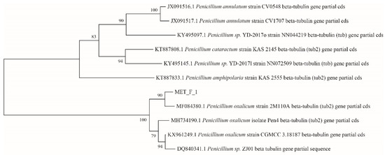 Colonies of MET-F-1 grown on CDA medium were round and tiled, with white edges and a grey-green center (Figure 1A). Conidial structures were produced in large quantities and spore surfaces were lamellar. As shown in Figure 1B, the conidia were observed to be oval, smooth, and fastigiated, in chains with the sizes of 3.2–8.3 × 2.5–5.0 μm by the microscope. Comparing the ITS rDNA gene sequence of MET-F-1 with the GenBank sequence in NCBI, 99% sequence homology to Penicillium oxalicum was observed. A dendrogram based on known representatives of Penicillium species is presented in Figure 2. Based on the genetic and morphological characteristics, strain MET-F-1 was identified as Penicillium oxalicum.