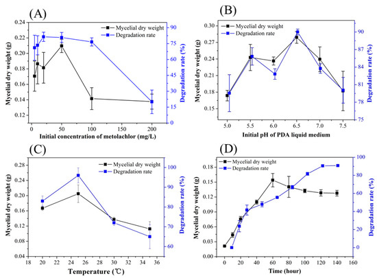 To obtain the optimum degradation condition parameters for this strain, the effects of initial concentration of metolachlor, pH, temperature, and culture time on its metolachlor-degrading potential were investigated by determining metolachlor residues, and the mycelial dry weights were measured using a completely randomized design (Figure 3).