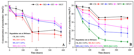 Under optimized environmental conditions, as described above (i.e., pH 6.5 and temperature 25 °C), 10% inoculation amount of strain MET-F-1 was performed in MSM with a metolachlor concentration of 50 mg/L. As shown in Figure 4A, metolachlor had similar degradation rates in the absence of MSM (CK) and other treatments with different nutrients (i.e., MG, MY, and MGY) after 384 h of cultivation, ranging from 22.1 ± 3.7% in the treatment of MGY to 32.0 ± 2.2% in MG, despite some differences in the degradation process. This suggests that photodegradation and chemical hydrolysis contribute little to the degradation of metolachlor, consistent with previous studies [18,31]. However, as shown in Figure 4B, after inoculation with strain MET-F-1, treatments with nutrients, i.e., MFG, MFY, and MFGY, exhibited significant enhancement in the degradation of metolachlor compared with that in CK, even with 86.6 ± 2.2% in MFGY at 384 h. At the same time, in the treatment of MF, the degradation rate of metolachlor was comparable with that of CK. These results indicated that the fungus is barely able to use metolachlor as a sole source of carbon and nitrogen for growth and instead lived on other nutrient sources, e.g., glucose, yeast extract, and similar mixtures, which are easily utilized.