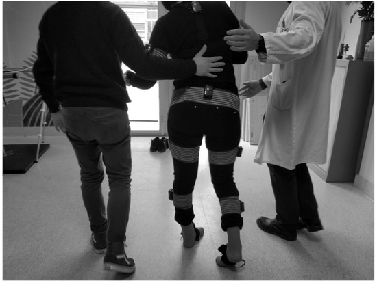 Gait test in hospital. The sensor placement is shown on a patient with spasticity.