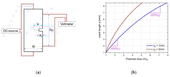 (a) Schematic drawing of the setup of the direct current potential drop (DCPD) measurement; (b) the resolution of the direct current potential drop method (DCPDM) depends on the distance of the potential grips 2y0 and the crack length a.