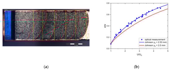 For the calibration of the DCPDM, the marking of the crack length by means of overloads as well as marker loads has proven itself. A suitable method to equalize the curvature of the crack front is the measurement of the crack area. The mean crack length is obtained by dividing the measured crack area by the specimen width. For a SEN-specimen made of AA7475, the crack fronts marked by overloads are shown in Figure 2a as red lines and the resulting mean crack lengths perpendicular to the propagation direction are shown as yellow dashed lines. Regarding this, a linear dependency of potential and crack length is assumed, whereby the error in the case of curved crack fronts can only be minimized, but not eliminated [30,31]. The calibration is undertaken by drawing the optical crack length a divided by the specimen width (w) against the measured potential drop U/U0 and adapting the Johnson equation with a least square fit by using the distance of the potential grips y0 as a free parameter. As a result, a grip spacing of y0 = 2.53 mm was obtained. The curve for the geometrical grip spacing of y0 = 2 mm added for comparison in Figure 2b shows clearly that the actual crack length is underestimated when using the real geometric spacing of the potential grips.