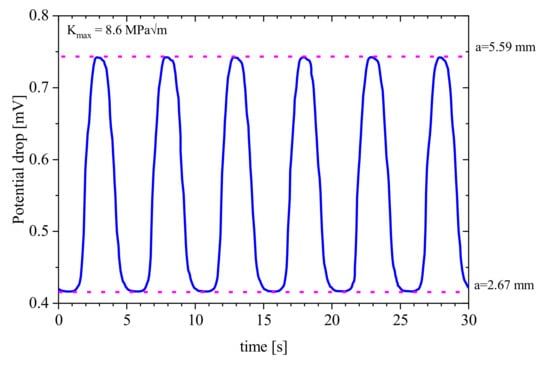 In case of aluminum alloys, this effect is of minor importance due to the rapid formation of an insulating oxide layer on the crack surface, so that the differences between maximum and minimum values within a cycle are very small. Crack propagation measurements under symmetrical tension-compression loading on a SEN-specimen of a particle-reinforced aluminum alloy in dry nitrogen atmosphere, however, show an extreme change of the potential within a cycle due to the lack of oxide layer formation on the fracture surfaces (Figure 3) [36]. The measured potential varies more than 0.3 mV within a cycle which corresponds to a change in the crack length of nearly 3 mm. This example impressively underlines the need to use the maximum value of the potential to determine the crack length.