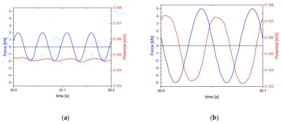 Change of the potential in an unalloyed ferritic steel (C45E) at loading frequencies of 20 Hz: (a) at low loading the potential remains nearly constant; (b) at higher loadings, a distinct change of the potential due to the Villari effect is visible. The maximum and minimum of the potential appear at the zero-crossing of the force where the change of the force per time is highest.