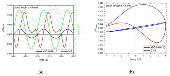 In the case of samples with cracks, the superposition of crack opening effects and the Villari effect results in more complex potential hysteresis loops. A direct comparison of the potential curve of a sample made of ferritic steel C45E and one made of austenitic steel X5CrNi18-10 with a crack length of about 6 mm each is shown in the Figure 5a. The ferritic steel shows a complex potential curve that is caused by the superposition of the crack opening that occurs synchronously with the load and the phase shifted Villari effect. The potential changes caused by the Villari effect are significantly higher than the effects caused by crack opening and closing. In Figure 5b, the corresponding hysteresis loops are shown. The austenitic steel has the maximum and minimum potential values at the force maximum and minimum, whereas the ferritic steel exhibits a completely deformed hysteresis loop with maximum and minimum values for the potential far away from the maximum and minimum loading.