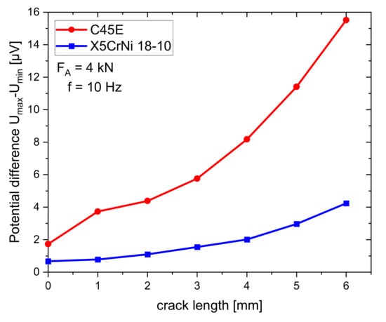 In addition to the frequency and the load level, the crack length also influences the magnitude of the potential changes caused by the Villari effect. Figure 6 shows the potential change within a cycle measured on SEN specimens made of C45E and X5CrNi18-10 tested at a test frequency of 10 Hz under fully reversed cyclic loading with a load amplitude of 4 kN as a function of the crack length. The austenitic steel shows a potential difference that increases slightly with increasing crack length. This is due to the contact of the crack flanks under compression loading, where the contact area increases with the crack length. In the case of the ferromagnetic sample made from C45E, the increase in the potential difference is much steeper. This increase cannot be explained by the contact of the crack flanks alone, it is rather an increasing potential difference due to the Villari effect. Davis and Plumbridge [37] observed the same effect in their investigations. This increase in the potential difference can be attributed to the stresses at the crack tip increasing with the length of the crack, and the magnetic properties that depend on the crack length [39].