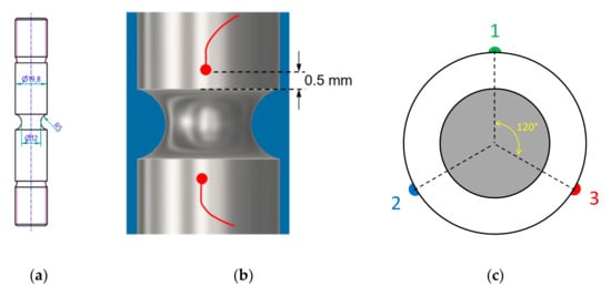 The investigations for crack detection on notched round bars were carried out on specimens of a high-alloy steel (X8CrNi18-9) with a diameter of 19.8 mm and a circumferential notch with a radius of 5 mm and a depth of 3.9 mm as shown in Figure 7a. To measure the potential, wires with a diameter of 0.2 mm were spot-welded to the specimen surface at a distance of 0.5 mm from the upper or lower edge of the notch (Figure 7b). The three measuring points were equidistantly arranged along the circumference of the sample with an angle of 120° in between two points, as shown in Figure 7c.