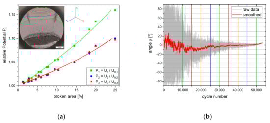 Data of an experiment without prior temperature stabilization: (a) run of the three relative potentials and the crack surface with marked crack extensions; (b) calculated angle ϕ showing a crack initiation after about 110,000 cycles. The crack was initiated at an angle ϕ of 103°, the green square at N = 115,000 corresponds to a cracked area of 1.27%, the blue square at N = 130,000 to 4.8%.