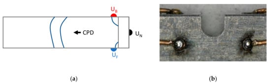 The investigations were carried out on SEN-specimens with a size of 80 × 12 × 2.8 mm made of aluminum alloy 7475 T761. The potential grips were spot-welded in a distance of 1.5 mm from the notch root. As shown in Figure 10a, potential probes were attached to the front (UF), the rear (UB), and the narrow (UN) side of the sample. Figure 10b shows an optical micrograph of the spot-welded wires beneath the notch.