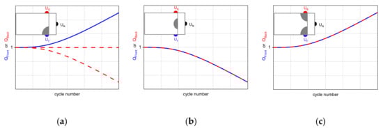 The measured potentials UF, UB, and UN were normalized according to Equation (2) to the mean value of the first 10 cycles UF,0, UB,0, and UN,0, respectively. From the relative potentials PF, PB, and PN determined in this way, the quotients QFront and QBack were calculated according to Equation (3):