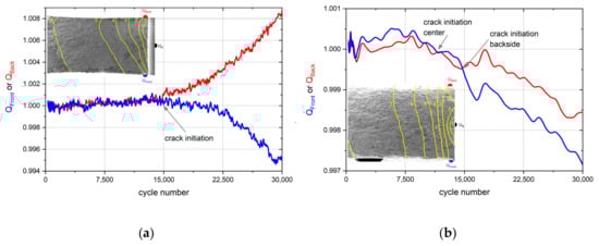 In a further sample shown in Figure 12b, an additional laser notch was used to force a crack initiation in the center of the notch root. The contour of the first overload (N = 15,000) shows this crack having a length of 0.7 mm and a depth of 0.2 mm. After 30,000 cycles, an additional crack has formed at the backside of the sample. The formation of both cracks is visible in the run of the potential quotients QFront and QBack. The formation of a crack in the center of the notch root leads to a decrease of both potential quotients starting from around 11,000 cycles. The formation of the secondary crack is obviously initiated by the application of the overload at 15,000 cycles and results in a separation of the previously congruent potential curves: the potential quotient QBack decreases less than the quotient QFront.
