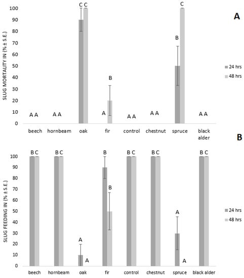 The contact efficiency of wood ash after 24 h under laboratory conditions resulted in 90 ± 10% (N = 10) mortality of the slugs treated with oak wood ash (see Figure 1A). High slug mortality was also achieved after 24 h of treatment with spruce wood ash (50 ± 17%, N = 10) (see Figure 1A). Except for oak and spruce, wood ash from other plant species did not cause slug mortality after 24 h. Our results showed that 100 ± 0% (N = 10) of the slugs treated with oak and spruce wood ash died after 48 h. Besides oak and spruce, 48 h after the slugs’ exposure to fir wood ash also caused the slugs mortality (20 ± 10%, N = 10). However, wood ash from other tested plant species did not impact slug mortality (see Figure 1A).