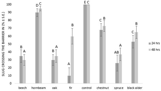 The effect of wood ash as a physical barrier for slugs to cross in periods 24 and 48 h after treatment are presented in Figure 2. The efficacy of fir wood ash as a slug barrier was 90% (N = 10) after 24 h since only 10 ± 10% (N = 10) of tested slugs crossed the barrier. After 24 h, less than 40% (N = 10) of slugs crossed the barriers made from spruce, oak, and beech wood ash. Hornbeam wood ash proved to be the least effective since more than 90% (N = 10) of slugs crossed the barrier after 24 h (see Figure 2). The efficacy of beech wood ash as a slug barrier was 70% (N = 10) after 48 h since only 30 ± 7% (N = 10) of tested slugs crossed the barrier. After 48 h, less than 40% (N = 10) of the slugs crossed the barriers made from oak and spruce wood ash. Hornbeam wood ash again proved to be the least effective, since more than 95% (N = 10) of the slugs crossed the barrier after 48 h (see Figure 2).