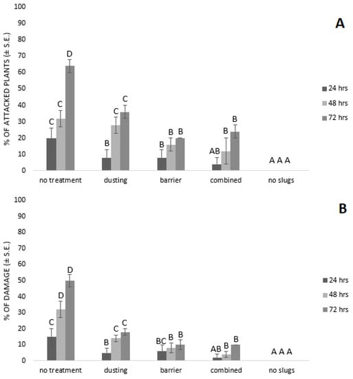 Significant differences (F = 2.69; p = 0.0406) were found between the treatments in semi-field trials for the percentage of attacked plants after 24 h Attacked plants were found in all treatments except in the positive control (see Figure 3A). The lowest intensity of slugs’ attack (only 4 ± 4%; N = 25) was found after 24 h in the treatment where the combination of techniques was used. In the same period, 20 ± 6% (N = 25) of the plants were attacked in the negative control. Significant differences for the intensity of slugs attack (F = 6.44; p = 0.0017) were found between the treatments after 48 h as well, and slugs attacked plants to a certain extent in all except positive control treatment (see Figure 3A). When the combined method was used, the intensity of the slug attack was the lowest (12 ± 8%, N = 25). This treatment differed significantly when compared to the negative control (32 ± 5%, N = 25) and dusting (28 ± 5%, N = 25). Significant differences for the intensity of attack (F = 57.83; p < 0.0001) were found also between the treatments after the third observation (72 h), and slugs attacked plants in all treatments besides the positive control (see Figure 3A). When a barrier was used in semi-field trials, only 20 ± 0% (N = 25) of attacked plants were recorded, while in the same period 64 ± 4% (N = 25) of attacked plants were observed in the negative control (see Figure 3A).