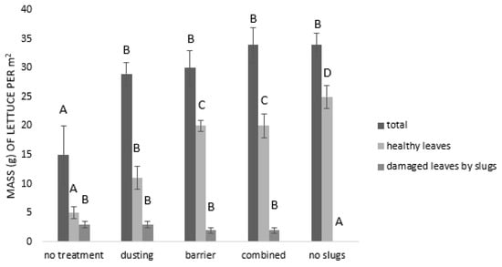Slugs significantly affected the total yield (F = 6.24; p = 0.0020) of lettuce seedlings (see Figure 4). Combined techniques were the best protective method against the slugs since the highest yields were measured in this treatment (34 ± 4 g plant), while the lowest yield was measured in the negative control (15 ± 5 g plant). The yield of the healthy leaves differed also significantly among the treatments (F = 20.34; p < 0.0001). The highest yields were measured in the positive control (25 ± 2 g plant), and the lowest were obtained in the negative control (5 ± 2 g plant). There were no significant differences between the barrier alone (20 ± 1 g plant) or the combined method (20 ± 2 g plant); however, both methods proved to yield more healthy leaves than only the dusting of slugs (11 ± 2 g plant) (see Figure 4). Significant differences (F = 15.05; p < 0.0001) for a yield of the damaged leaves were found between the treatments. Similarly to the results of total yield and yield of healthy leaves, the mass of damaged leaves was highest in the negative control (3 ± 1 g plant), and the lowest in the positive control (0 ± 0 g plant).
