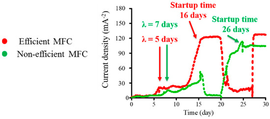 Current density production growth curve of two representative microbial fuel cells (MFCs), efficient and non-efficient. λ is lag phase length, the time it took to reach 30 mV.