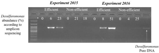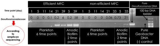 PCR products obtained with the specific 16S-Desulfuromonadaceae primers for efficient and non-efficient MFCs. Relative abundance of Desulfuromonadaceae according to amplicon sequencing is shown. Last lane from the left is a 100 bp size ladder.