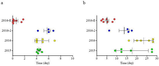 Summary of (a) lag time and (b) startup time for all experiments in this work, i.e., 2015, 2016, 2016-S, 2016-2, and 2016-E.