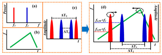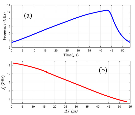 where is the frequency of the generated LFM signal. As shown in Figure 2d, a pair of pulses can be observed at the output of the low passband filter in one sweep period, where one pulse is the beat-note signal between the input microwave signal and the positive chirp rate section of the generated LFM signal, the other comes from the beat-note signal between the input microwave signal and the negative chirp rate section of the generated LFM signal. The down-conversion frequency at the output of the low passband filter can be written as