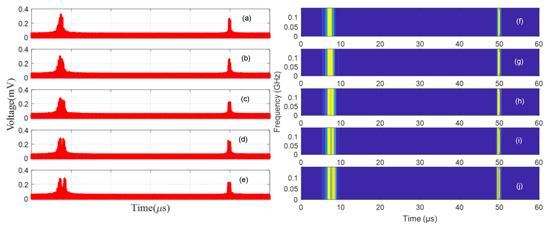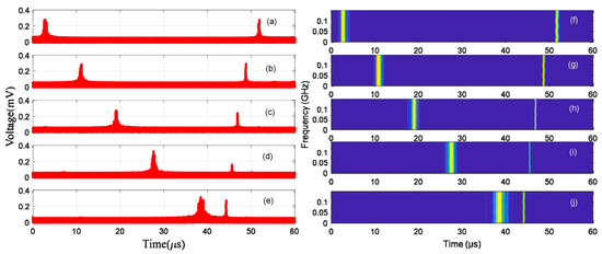 Multifrequency measurement based on the proposed microwave frequency measurement system was also verified. Two-tone signal at 5 and 5.3 GHz from two signal generators are combined using an electrical power combiner and then injected into the electrical mixer. The pulses from the output of the low passband filter are shown in Figure 7a and its real-time frequency distribution is calculated using STFT as the result shown in Figure 7b. The frequencies of unknown signals were mapped using the FTM relationship with the time differences ≈ and . The frequency measurement accuracy for multiple frequencies based on the proposed frequency measurement system was also demonstrated. The fixed frequency was set as 5 GHz and the other frequency was changed from 5.1 to 5.3 GHz with a frequency step of 0.05 GHz, where the measured results are shown in Figure 8a–e. The time differences with different frequency spaces are calculated in Figure 8f–j after the STFT. From the results in Figure 8f–j, we can know that the frequencies of two-tone cannot be clearly distinguished when the frequency space less than 100 MHz. From Figure 7b, we can find that two peaks are close to each other and the 3-dB bandwidth of the recorded two-tone signal is approximately double the 3-dB bandwidth of the single-frequency signal. As the frequency space increases, the measured microwave signal is obviously separated into two lines. Hence, the resolution of the proposed frequency measurement system for two-tone microwave signal is about 150 MHz. The measurement accuracy for two-tone is determined by the bandwidth of the electrical filter as well as the chirp-rate of the generated frequency-scanning microwave signal [11]. A higher chirp-rate by increasing the microwave frequency bandwidth can lead into a lower measurement error. Besides, a narrower electrical filter, which is 150 MHz in our experiment, can be expected to improve the measurement accuracy.