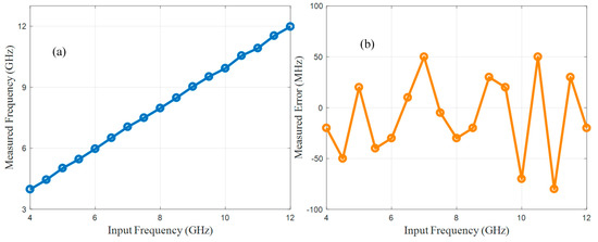 Frequency measurement results (a) and errors (b) for different frequency microwave signals.
