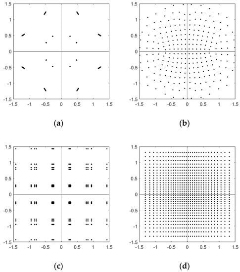 NUC can be classified into 1D-NUC and 2D-NUC, and its design process has been described in [14,15,16,17,18]. Symmetry is the first characteristic of NUC. To reduce the complexity of design and demapping, NUC only optimized the constellation points in the first quadrant, constellation points in other quadrants are derived from the first quadrant. Moreover, only the I component needs to be considered during 1D-NUC optimization, and the Q component is obtained according to symmetry. Thus, the I and Q components of 1D-NUC are independent and can be decomposed into two NU-PAMs. LLRs of 1D-NUC can be calculated using the one-dimensional demapper. The I and Q components of 2D-NUC constellation points are jointly optimized, so they are dependent, and a two-dimensional demapper is required to calculate LLRs.